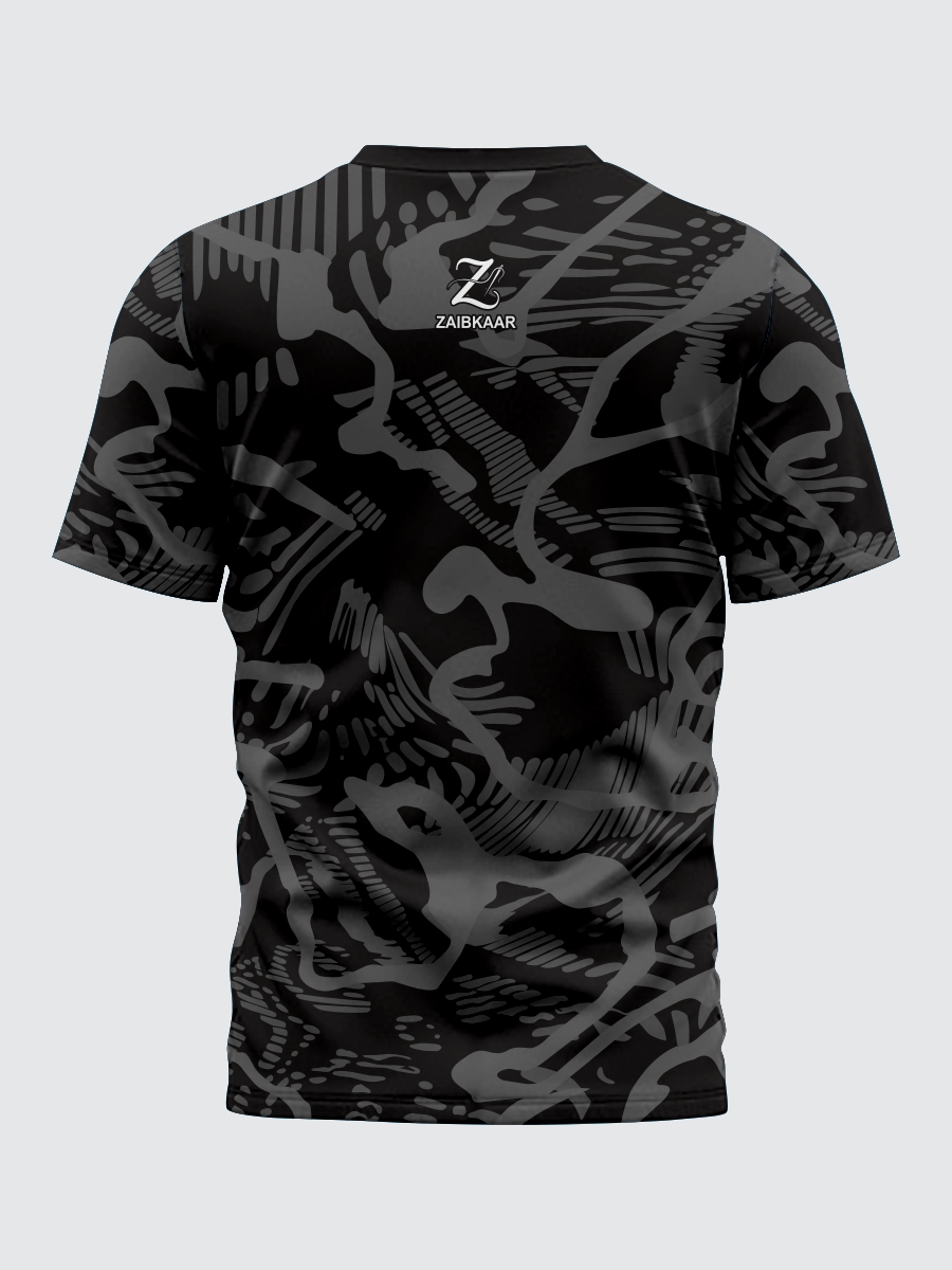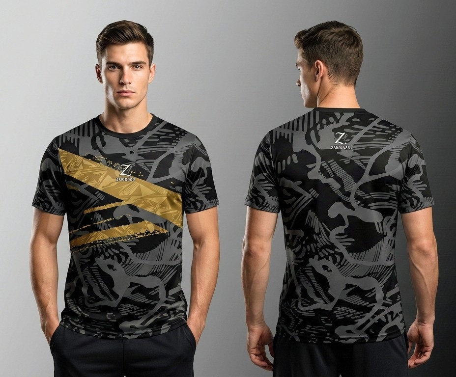 Make your mark with Zaibkaar Article 4. The “Golden Strike” design is a masterpiece of urban aesthetics, blending dark, multi-tonal textures with high-impact gold graphic elements. Whether you’re hitting the gym or the city streets, the premium breathable fabric and high-definition print ensure you look as sharp as you feel.